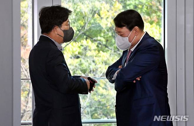 [서울=뉴시스] 최진석 기자 = 17일 국회 소통관에서 국민의힘 윤석열 대선 경선 후보가 기자회견에 앞서 권성동 종합상황본부장과 얘기를 나누고 있다. (공동취재사진) 2021.10.17. photo@newsis.com