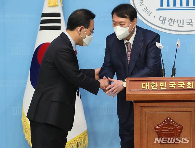 [서울=뉴시스] 최진석 기자 = 윤석열(오른쪽) 국민의힘 대선 경선 후보와 선거대책위원장으로 합류한 주호영 의원이 17일 오전 서울 여의도 국회 소통관에서 기자회견을 하며 악수하고 있다. (공동취재사진) 2021.10.17. photo@newsis.com