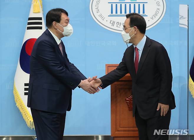 [서울=뉴시스] 최진석 기자 = 윤석열(왼쪽) 국민의힘 대선 경선 후보와 선거대책위원장으로 합류한 주호영 의원이 17일 오전 서울 여의도 국회 소통관에서 공동 기자회견을 갖고 악수하고 있다. (공동취재사진) 2021.10.17. photo@newsis.com
