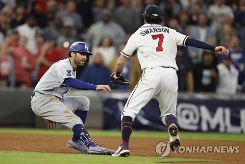 epa09528071 Los Angeles Dodgers baserunner Chris Taylor (L) is tagged out by Atlanta Braves shortstop Dansby Swanson after getting caught in a rundown as he tried to advance from first to third on a base hit by teammate Cody Bellinger in the top of the ninth inning of game 1 of the MLB National League Championship Series playoff baseball game between the Los Angeles Dodgers and the Atlanta Braves at Truist Park in Atlanta, Georgia, USA, 16 October 2021. EPA/ERIK S. LESSER