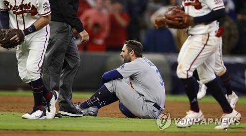epa09528072 Los Angeles Dodgers baserunner Chris Taylor (C) reacts after being tagged out by Atlanta Braves shortstop Dansby Swanson after getting caught in a rundown as he tried to advance from first to third on a base hit by teammate Cody Bellinger in the top of the ninth inning of game 1 of the MLB National League Championship Series playoff baseball game between the Los Angeles Dodgers and the Atlanta Braves at Truist Park in Atlanta, Georgia, USA, 16 October 2021. EPA/ERIK S. LESSER