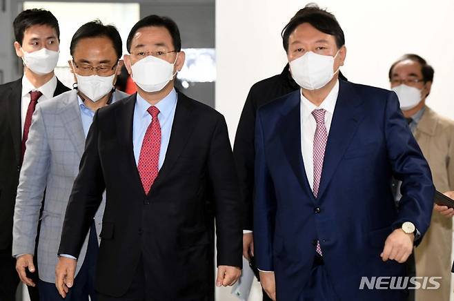 [서울=뉴시스] 최진석 기자 = 윤석열(오른쪽) 국민의힘 대선 경선 후보와 선거대책위원장으로 합류한 주호영 의원이 17일 오전 서울 여의도 국회 소통관에서 기자회견을 위해 함께 이동하고 있다. (공동취재사진) 2021.10.17. photo@newsis.com