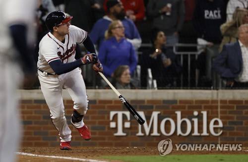epa09528078 Atlanta Braves batter Austin Riley hits a game-winning walk-off single against the Los Angeles Dodgers in the bottom of the ninth inning of game 1 of the MLB National League Championship Series playoff baseball game between the Los Angeles Dodgers and the Atlanta Braves at Truist Park in Atlanta, Georgia, USA, 16 October 2021. EPA/ERIK S. LESSER