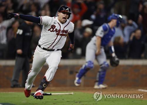 epa09528083 Atlanta Braves batter Austin Riley (L) celebrates as he heads to first base after hitting a game-winning walk-off single against the Los Angeles Dodgers in the bottom of the ninth inning of game 1 of the MLB National League Championship Series playoff baseball game between the Los Angeles Dodgers and the Atlanta Braves at Truist Park in Atlanta, Georgia, USA, 16 October 2021. EPA/ERIK S. LESSER