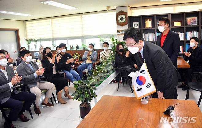[부산=뉴시스] 하경민 기자 = 국민의힘 유승민 대선 경선 후보가 17일 부산 강서구 북강서을 당원협의회를 방문, 당원들에게 고개를 숙여 인사하고 있다. 2021.10.17. yulnetphoto@newsis.com
