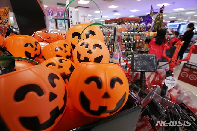 [서울=뉴시스] 조수정 기자 = 올해 핼러윈 데이는 코로나19로 인한 사회적 거리두기 속에서 '홈로윈' 트렌드가 될 것으로 유통업계가 전망했다. 17일 오전 서울 성동구 이마트 성수점에서 소비자들이 가정에서 활용할 수 있는 핼러윈 용품을 고르고 있다. 2021.10.17. chocrystal@newsis.com