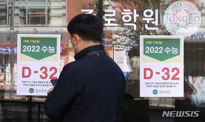 [서울=뉴시스] 박미소 기자 = 2022학년도 대학수학능력시험이 32일 남은 17일 오전 서울 마포구 종로학원 강북본원에 수능까지 남은 일자가 적힌 안내문이 붙어있다. 2021.10.17. misocamera@newsis.com