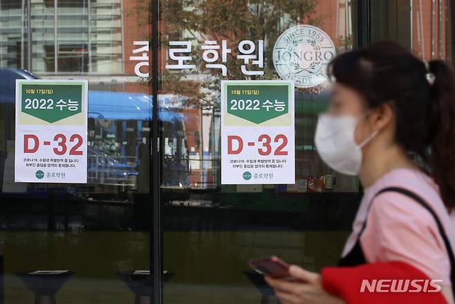 [서울=뉴시스] 박미소 기자 = 2022학년도 대학수학능력시험이 32일 남은 17일 오전 서울 마포구 종로학원 강북본원에 수능까지 남은 일자가 적힌 안내문이 붙어있다. 2021.10.17. misocamera@newsis.com
