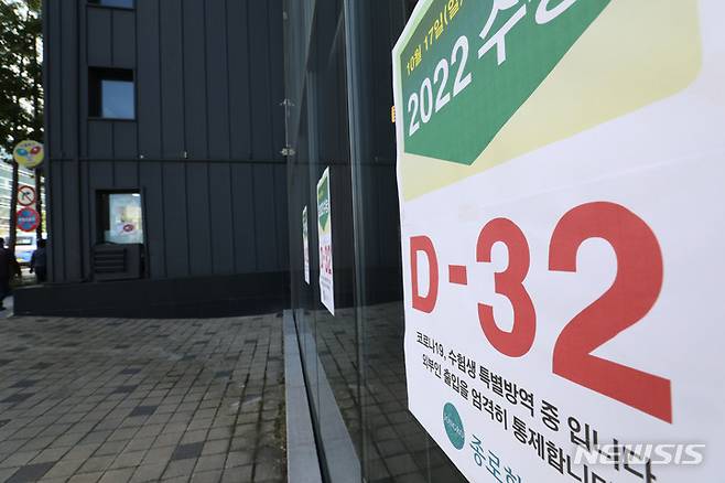 [서울=뉴시스] 박미소 기자 = 2022학년도 대학수학능력시험이 32일 남은 17일 오전 서울 마포구 종로학원 강북본원에 수능까지 남은 일자가 적힌 안내문이 붙어있다. 2021.10.17. misocamera@newsis.com