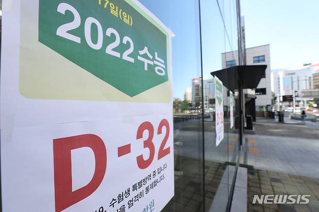 [서울=뉴시스] 박미소 기자 = 2022학년도 대학수학능력시험이 32일 남은 17일 오전 서울 마포구 종로학원 강북본원에 수능까지 남은 일자가 적힌 안내문이 붙어있다. 2021.10.17. misocamera@newsis.com