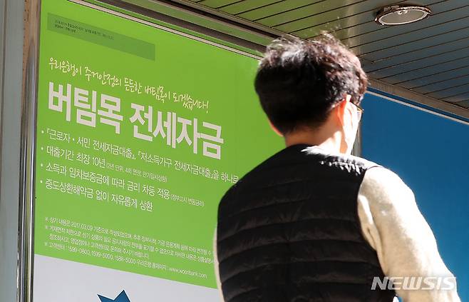 [서울=뉴시스] 백동현 기자 = 시중 5대 은행(KB국민·신한·하나·우리·NH농협)이 전세대출 갱신 한도를 '전셋값 증액 범위 이내'로 제한하기로 합의한 것으로 알려진 가운데 17일 오전 서울 시내 한 은행에 대출 관련 안내문이 붙어있다. 2021.10.17. livertrent@newsis.com
