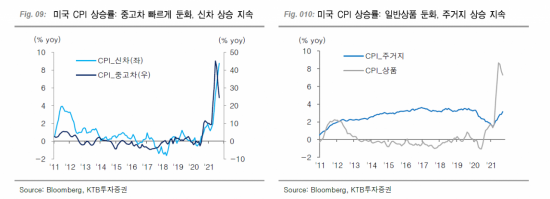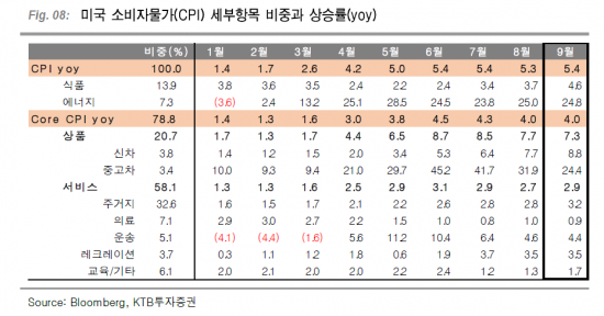 KTB투자증권은 4분기 미국 근원 CPI 상승률의 관건은 신차 물가 상승률 둔화 여부로 봤다. 공급망 관련 대표성을 갖기 때문이다. 박 팀장은 "지난 10년간 최대 상승률의 두 배를 훌쩍 넘는 전년 동기 대비 8.8% 상승을 기록한 신차 물가 상승률이 4분기 중 둔화되면 공급망 혼란 해소의 시작을 알리는 신호가 될 수 있다"고 분석했다.