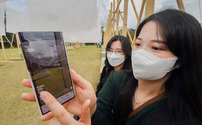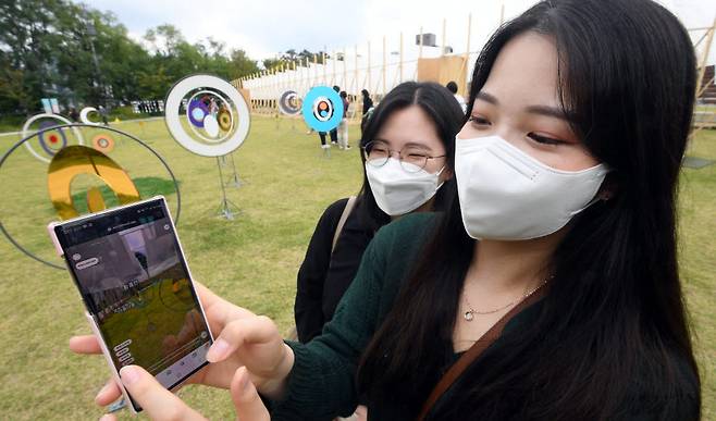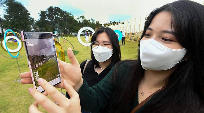 증강현실(AR)로 미술작품을 감상할 수 있는 '2021 서울은 미술관 공공미술축제-노들,바람보다' 축제가 열렸다. 17일 서울 용산구 노들섬에서 시민이 총 9개 작품 및 프로그램을 AR 플랫폼으로 구현한 전시를 모바일로 보고 있다. 전시는 11월 30일까지 진행된다.