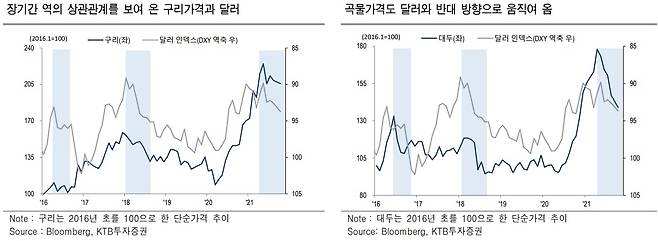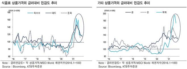 김한진 KTB투자증권 연구원은 “금융완화가 시작된 작년 4월부터 모든 상품가격은 경제봉쇄와 수요급감에도 불구하고 가파르게 상승했다”며 “앞으로 금리상승은 상품가격의 상승탄력을 둔화시킬 수 있다”고 전망했다.