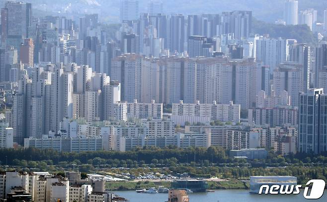 (서울=뉴스1) 김명섭 기자 = 17일 국민의힘 김상훈 의원(대구 서구, 국토교통위원회)이 한국부동산원의 '2017년 6월~2021년 6월' 서울아파트 매매 시세현황을 분석한 결과, 서울 내 시세 9억 초과 아파트 비중이 문재인 정부가 들어선 2017년 6월엔 15.7%였지만, 임기 후반부인 2021년 6월 현재 56.8%로 급증한 것으로 나타났다. 사진은 이날 강남지역 아파트 모습. 2021.10.17/뉴스1