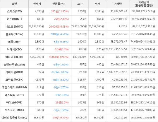 가상화폐 비트코인 26,000원 상승한 74,832,000원에 거래