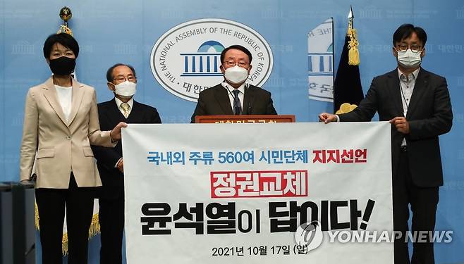 (서울=연합뉴스) 하사헌 기자 = 이갑산 범시민사회단체연합 상임대표가 17일 국회 소통관에서 열린 '범시민단체연합 등 500여 시민사회단체' 국민의힘 윤석열 대선 경선 후보 공식 지지선언 기자회견에서 지지선언문을 발표하고 있다. 2021.10.17 [국회사진기자단]