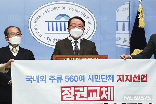 [서울=뉴시스] 최진석 기자 = 이갑산 범시민사회단체연합 상임대표가 17일 국회 소통관에서 열린 '범시민단체연합 등 500여 시민사회단체' 국민의힘 윤석열 대선 경선 후보 공식 지지선언에서 지지선언문을 발표하고 있다. (공동취재사진) 2021.10.17. photo@newsis.com