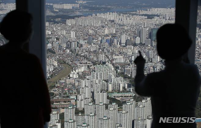 [서울=뉴시스] 조수정 기자 = 전국 아파트 평균 매매가가 처음으로 5억원을 넘어섰다. 정부가 오피스텔 규제 완화를 발표하며 오피스텔도 매매, 전세, 월세 모두 상승한 것으로 나타났다. 사진은 17일 서울 송파구 롯데월드타워 전망대 서울스카이에서 바라본 서울 시내 아파트와 오피스텔. 2021.10.17. chocrystal@newsis.com