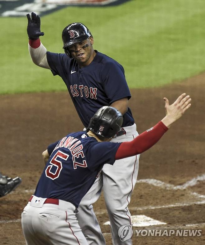 16일(현지시간) 미국 텍사스주 휴스턴 미닛메이드파크에서 휴스턴 애스트로스와 벌인 아메리칸리그 챔피언십시리즈(ALCS) 2차전 2회 말에 보스턴 레드삭스의 라파엘 데버스(뒤쪽)가 만루 홈런을 터뜨린 뒤 홈에서 팀 동료 키케 에르난데스(앞쪽)와 환호하고 있다.