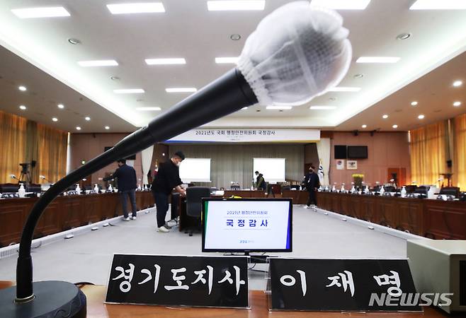 [수원=뉴시스] 김종택기자 = 국회 행정안전위원회의 경기도 국정감사를 하루 앞둔 17일 오후 경기도 수원시 경기도청에서 직원들이 국감준비를 하며 분주하게 움직이고 있다. 2021.10.17.