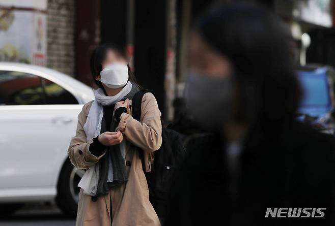 [서울=뉴시스] 박미소 기자 = 서울 최저기온이 1.3도를 기록한 17일 오후 서울 종로구 젊음의 거리 인근에서 두꺼운 옷을 입은 시민들이 걸어가고 있다. 2021.10.17. misocamera@newsis.com