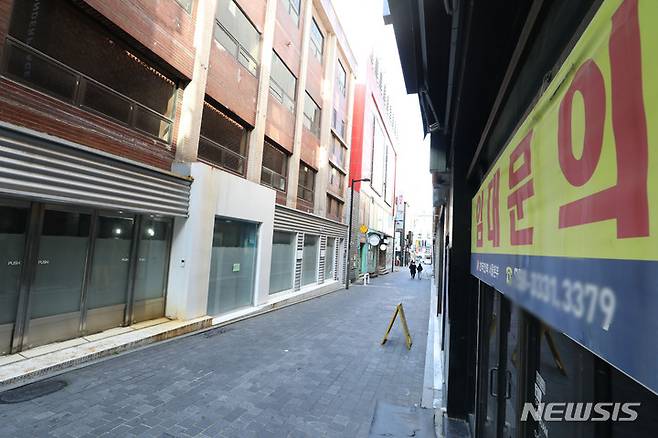 [서울=뉴시스] 박미소 기자 = 현행 사회적 거리두기 단계를 2주 연장을 하루 앞둔 17일 오후 서울 중구 명동 거리 점포에 임대 문의가 붙어있다. 수도권을 비롯한 4단계 지역에서는 시간에 관계없이 접종 완료자 4~8명을 포함해 최대 8명까지 모일 수 있다. 4단계 지역의 식당·카페 영업 시간은 밤 10시까지로 계속 제한되지만 독서실·공연장·영화관은 밤 12시까지 운영할 수 있게 된다. 2021.10.17. misocamera@newsis.com
