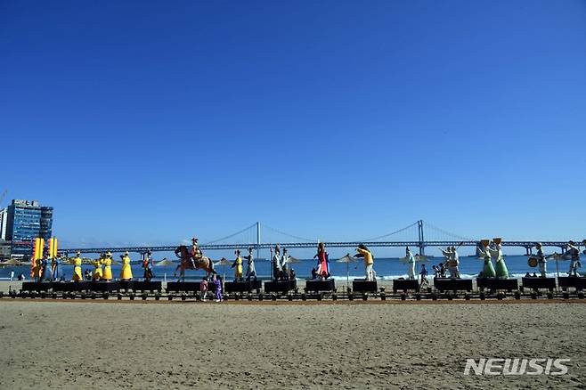 [부산=뉴시스] 하경민 기자 = 17일 부산 수영구 광안리해수욕장 백사장에 경상좌도수군절도사 행렬 조형물이 설치돼 나들이객들의 눈길을 사로잡고 있다. 2021.10.17. yulnetphoto@newsis.com