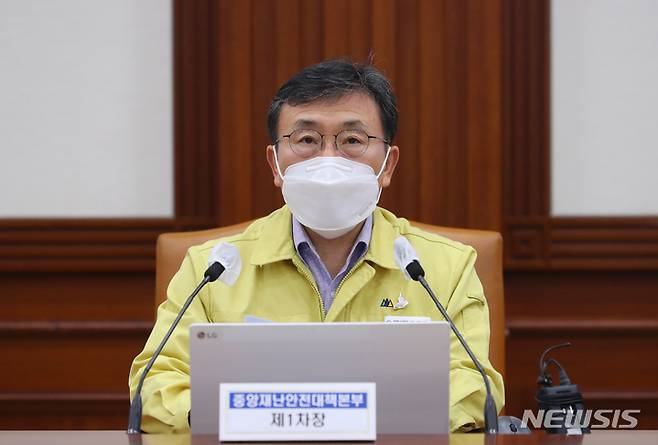 [서울=뉴시스] 배훈식 기자 = 권덕철 중앙재난안전대책본부(중대본) 제1차장이 17일 오후 서울 종로구 정부서울청사에서 열린 코로나19 중대본 회의에 참석해 발언하고 있다. 2021.10.17. dahora83@newsis.com
