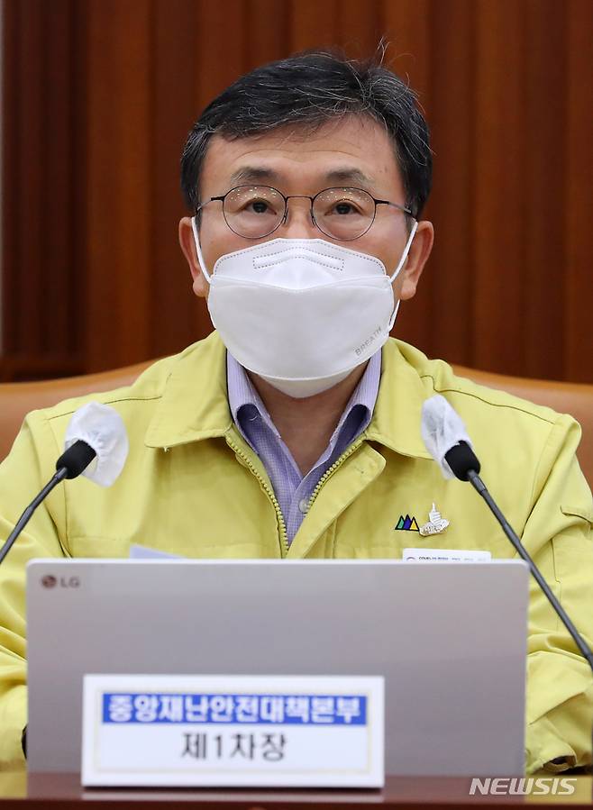 [서울=뉴시스] 배훈식 기자 = 권덕철 중앙재난안전대책본부(중대본) 제1차장이 17일 오후 서울 종로구 정부서울청사에서 열린 코로나19 중대본 회의에 참석해 발언하고 있다. 2021.10.17. dahora83@newsis.com