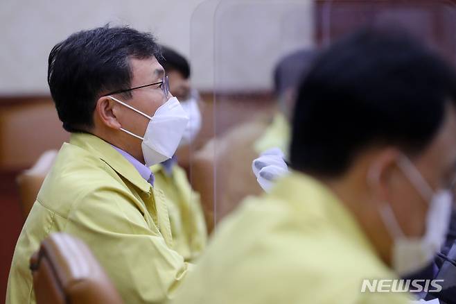 [서울=뉴시스] 배훈식 기자 = 권덕철 중앙재난안전대책본부(중대본) 제1차장이 17일 오후 서울 종로구 정부서울청사에서 열린 코로나19 중대본 회의에 참석해 발언하고 있다. 2021.10.17. dahora83@newsis.com