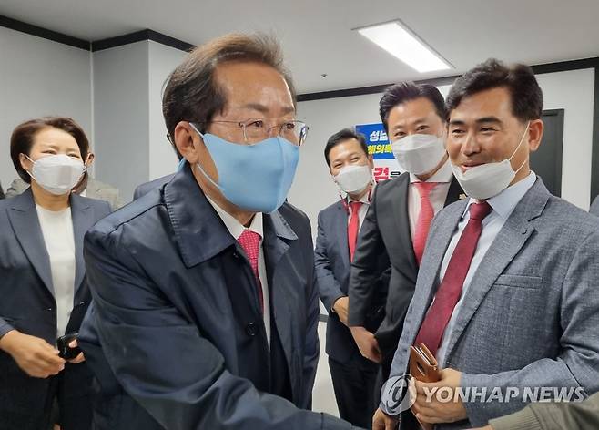 (대전=연합뉴스) 박주영 기자 = 국민의힘 홍준표 대선 경선 후보가 17일 대전을 찾아 당원과 악수하고 있다. 2021.10.17