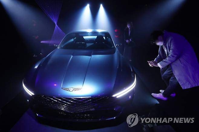 (서울=연합뉴스) 진연수 기자 = 17일 서울 성동구 디뮤지엄에서 열린 전시회 '제네시스 엑스 로드쇼'를 찾은 관람객들이 제네시스 콘셉트카인 '제네시스 엑스'를 살펴보고 있다. 202.10.17