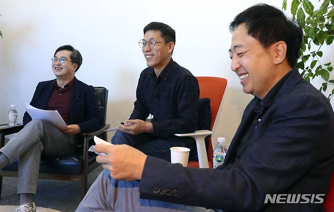 [서울=뉴시스] 최진석 기자 = 김동연(왼쪽) 전 경제부총리가 17일 서울 성동구 서울숲 포휴에서 열린 여야 대선 후보에 대한 정책을 검증하는 선후포럼에 참석해 시작에 앞서 대화를 나누고 있다. 왼쪽부터 김 전 부총리, 진중권 전 동양대 교수, 금태섭 전 의원.2021.10.17. myjs@newsis.com