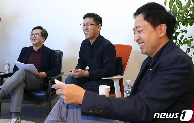 (서울=뉴스1) 국회사진취재단 = 김동연 전 경제부총리가 17일 서울 성동구 서울숲 포휴에서 열린 선후포럼에 참석해 시작에 앞서 대화를 나누고 있다. 왼쪽부터 김 전 부총리, 진중권 전 동양대 교수, 금태섭 전 의원. 2021.10.17/뉴스1