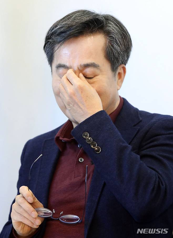[서울=뉴시스] 최진석 기자 = 김동연 전 경제부총리가 17일 서울 성동구 서울숲 포휴에서 열린 여야 대선 후보에 대한 정책을 검증하는 선후포럼에 참석해 눈을 만지고 있다. 2021.10.17. myjs@newsis.com