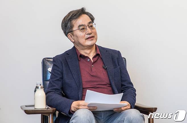 (서울=뉴스1) 국회사진취재단 = 대선출마를 선언한 김동연 전 경제부총리가 17일 오후 서울 성동구 왕십리의 한 사무실에서 열린 유튜브 채널 선후포럼(SF포럼) 생방송에 참석해 참석자들과 대화하고 있다. 2021.10.17/뉴스1