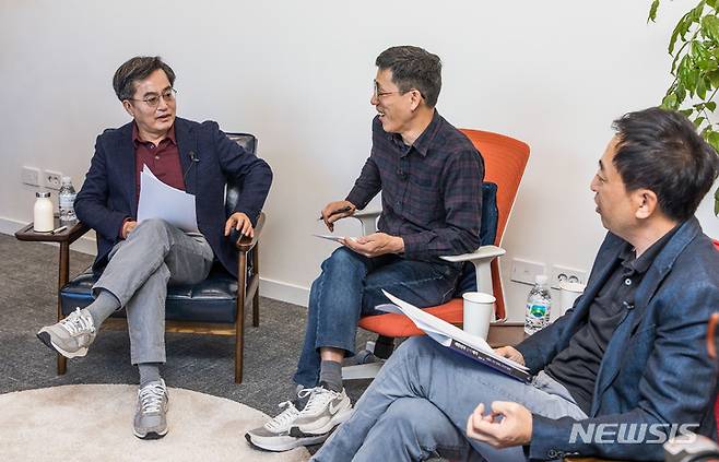 [서울=뉴시스] 국회사진기자단 = 대선 출마를 선언한 김동연 전 경제부총리가 17일 서울 성동구 서울숲 포휴에서 열린 여야 대선 후보에 대한 정책을 검증하는 선후포럼에 참석해 시작에 앞서 대화를 나누고 있다. 왼쪽부터 김 전 부총리, 진중권 전 동양대 교수, 금태섭 전 의원. 2021.10.17. photo@newsis.com