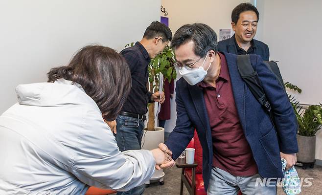 [서울=뉴시스] 국회사진기자단 = 대선 출마를 선언한 김동연 전 경제부총리가 17일 서울 성동구 서울숲 포휴에서 열린 여야 대선 후보에 대한 정책을 검증하는 선후포럼에 참석하며 권경애 변호사와 인사를 나누고 있다. 2021.10.17. photo@newsis.com