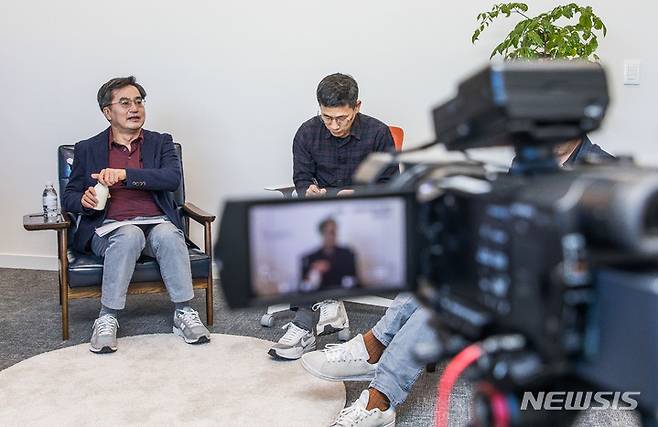 [서울=뉴시스] 국회사진기자단 = 대선 출마를 선언한 김동연 전 경제부총리가 17일 서울 성동구 서울숲 포휴에서 열린 여야 대선 후보에 대한 정책을 검증하는 선후포럼에 참석해 시작에 앞서 대화를 나누고 있다. 2021.10.17. photo@newsis.com