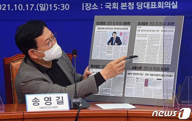 (서울=뉴스1) 오대일 기자 = 송영길 더불어민주당 대표가 17일 국회에서 열린 '고발사주 국기문란 진상조사 TF 발대식'에서 주요 일간지 지면에 '윤석열 징계' 관련 법원 판단 보도기사가 없다며 비판하고 있다. 2021.10.17/뉴스1