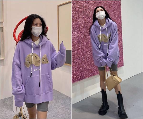 지인과 전시회를 찾은 이다인은 옅은 퍼플 컬러의 후드티와 짧은 레깅스를 매치하는 등 편한 의상으로 외출했다.