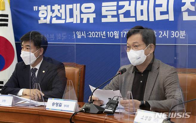 [서울=뉴시스] 최진석 기자 = 더불어민주당 송영길(오른쪽) 대표가 17일 오후 국회 본청에서 열린 ‘화천대유 토건비리 진상규명 태스크포스(TF)’ 첫 회의에서 모두발언을 하고 있다. 왼쪽은 김병욱 단장. (공동취재사진) 2021.10.17. photo@newsis.com