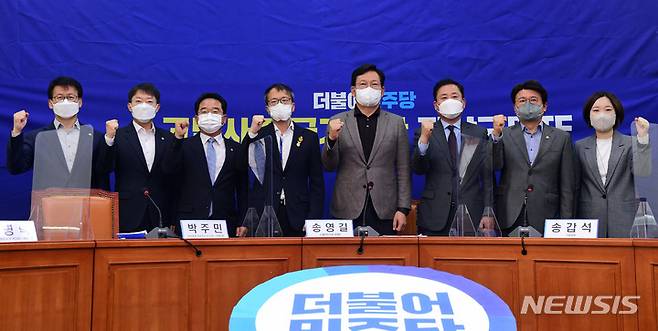[서울=뉴시스] 최진석 기자 = 송영길(왼쪽 다섯번째) 더불어민주당 대표와 박주민(왼쪽 네번째) TF단장을 비롯한 참석위원들이 17일 국회에서 열린 '고발사주 국기문란 진상조사 TF 발대식'에서 기념촬영을 하고 있다. (공동취재사진) 2021.10.17. photo@newsis.com