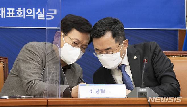 [서울=뉴시스] 최진석 기자 = 더불어민주당 송영길(왼쪽) 대표와 소병철 부단장이 17일 오후 국회 본청에서 열린 ‘화천대유 토건비리 진상규명 태스크포스(TF)’ 첫 회의에서 대화하고 있다. (공동취재사진) 2021.10.17. photo@newsis.com