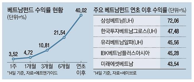국내 베트남펀드 중 가장 큰 규모인 한국투자베트남그로스펀드 수익률도 연초 이후 47.48%에 달한다. 해외 주식형 펀드 평균 수익률 8.88%와 비교하면 거의 5배 수준이다.