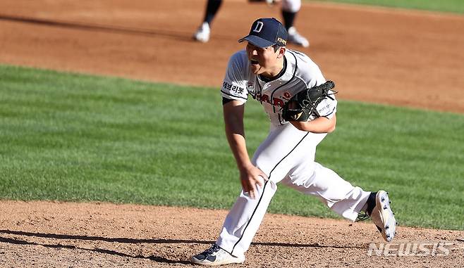 [서울=뉴시스] 이영환 기자 = 17일 오후 서울 송파구 잠실야구장에서 열린 2021 KBO리그 KIA 타이거즈와 두산 베어스의 더블헤더 1차전 경기, 5회초 두산 투수 권휘가 공을 던지고 있다. 2021.10.17. 20hwan@newsis.com