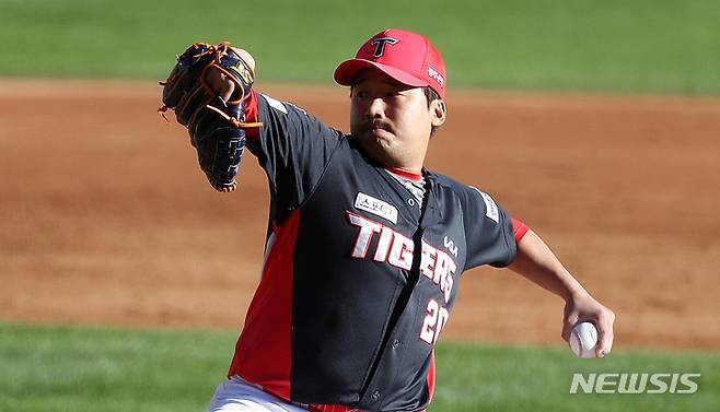[서울=뉴시스] 이영환 기자 = 17일 오후 서울 송파구 잠실야구장에서 열린 2021 KBO리그 KIA 타이거즈와 두산 베어스의 더블헤더 1차전 경기,4회말 KIA 투수 이준영이 공을 던지고 있다. 2021.10.17. 20hwan@newsis.com