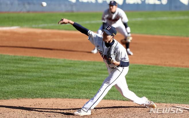 [서울=뉴시스] 이영환 기자 = 17일 오후 서울 송파구 잠실야구장에서 열린 2021 KBO리그 KIA 타이거즈와 두산 베어스의 더블헤더 1차전 경기,5회초 두산 투수 이승진이 공을 던지고 있다. 2021.10.17. 20hwan@newsis.com