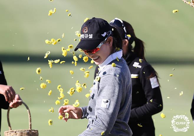 (서울=뉴스1) = 이정민이 17일 전북 익산CC에서 열린 '동부건설-한국토지신탁 챔피언십' 최종 라운드에서 우승을 확정 짓고 축하 받고 있다. (KLPGA 제공) 2021.10.17/뉴스1